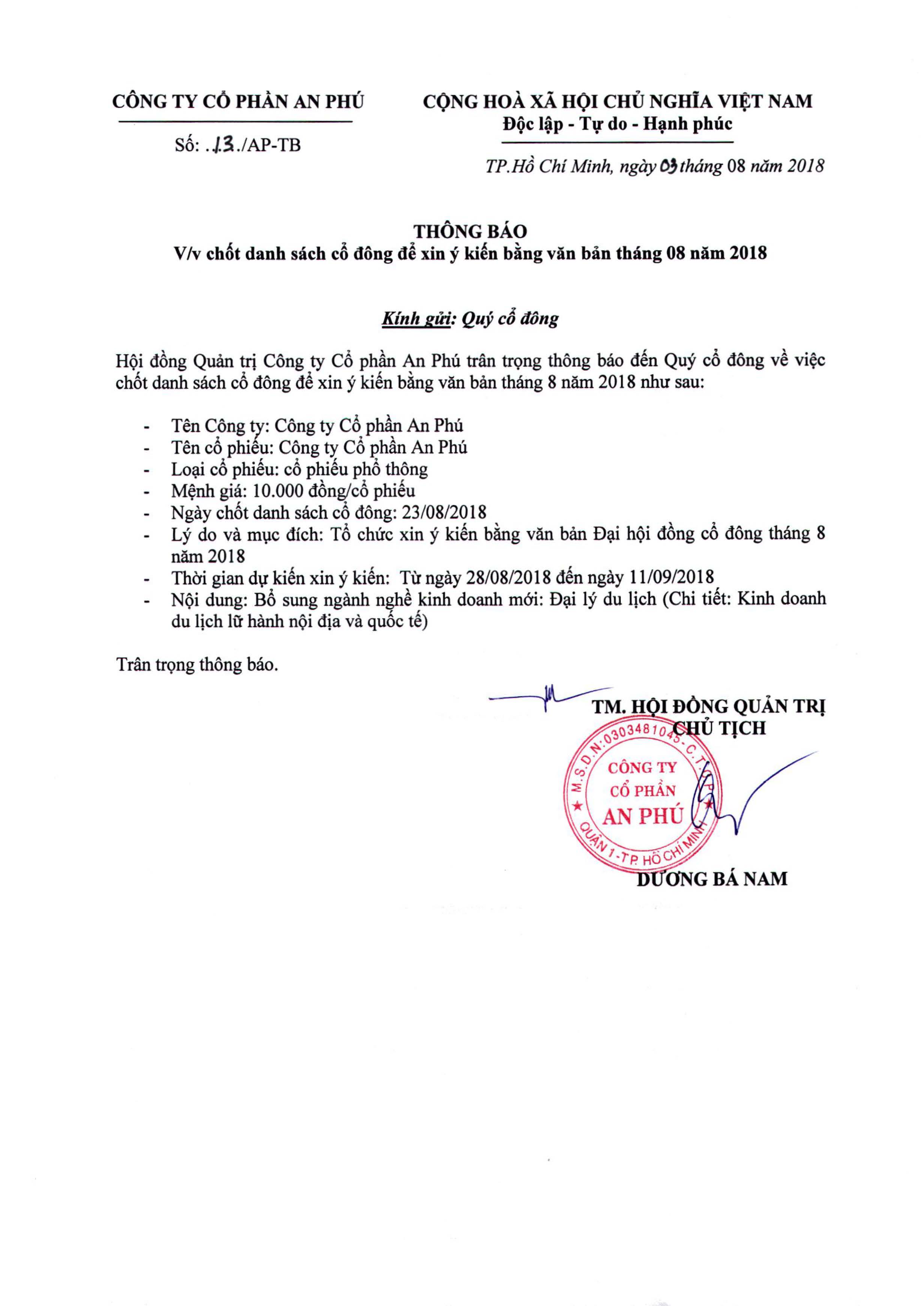 Thông báo chốt danh sách Cổ Đông để xin ý kiến bằng văn bản tháng 8 năm 2018