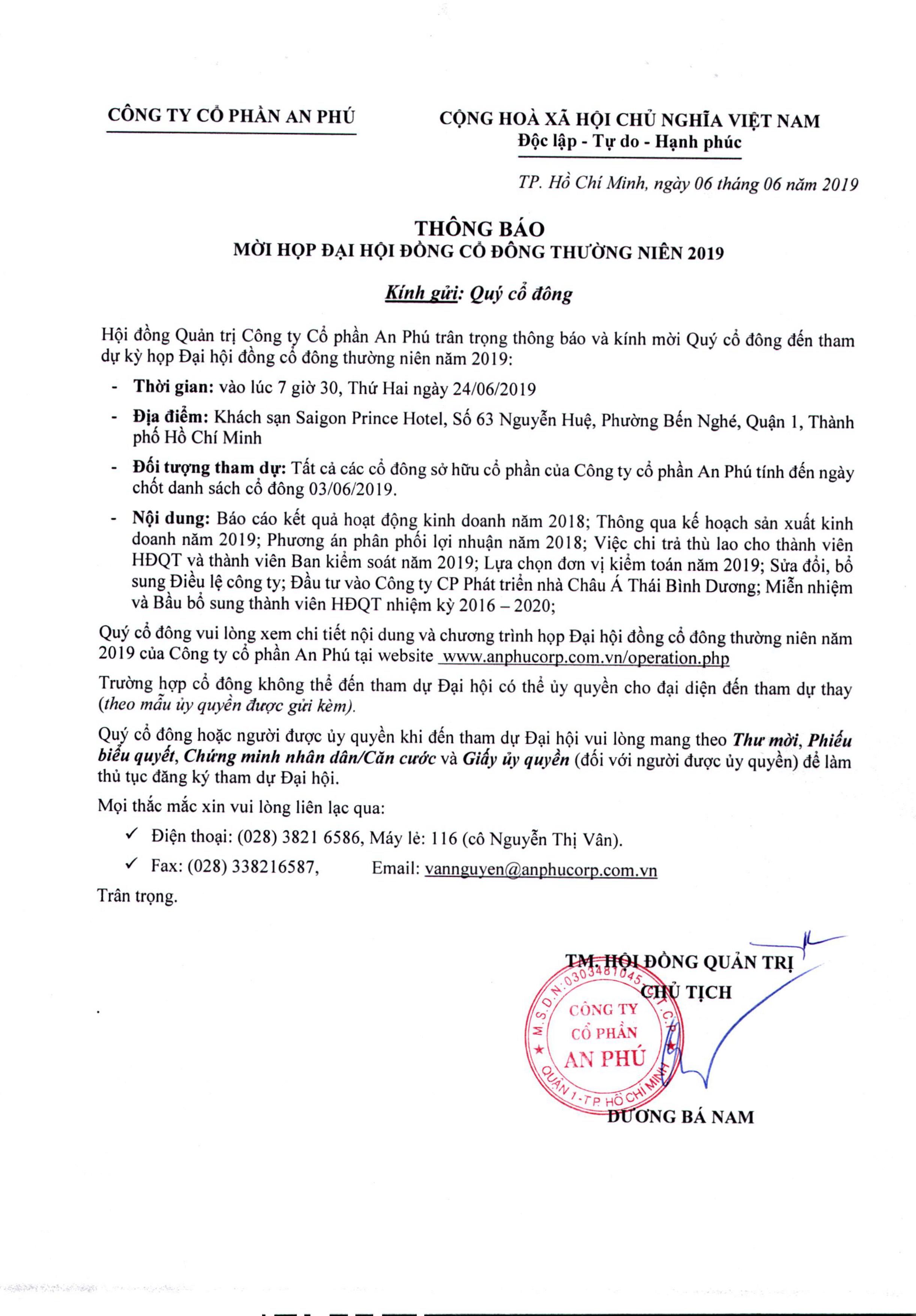 Thư mời họp Đại Hội Cổ Đông thường niên 2019